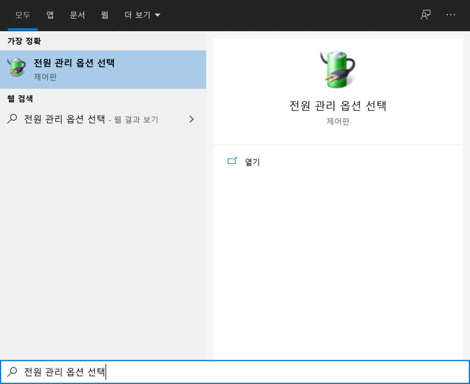1. 윈도우 검색에 전원 관리 옵션 선택 검색
